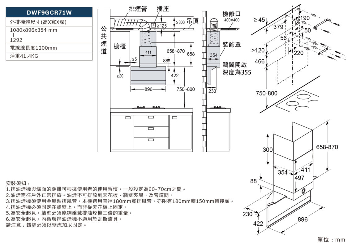 - 外排安裝尺寸(HxWxD):898x354x1080-1292mm