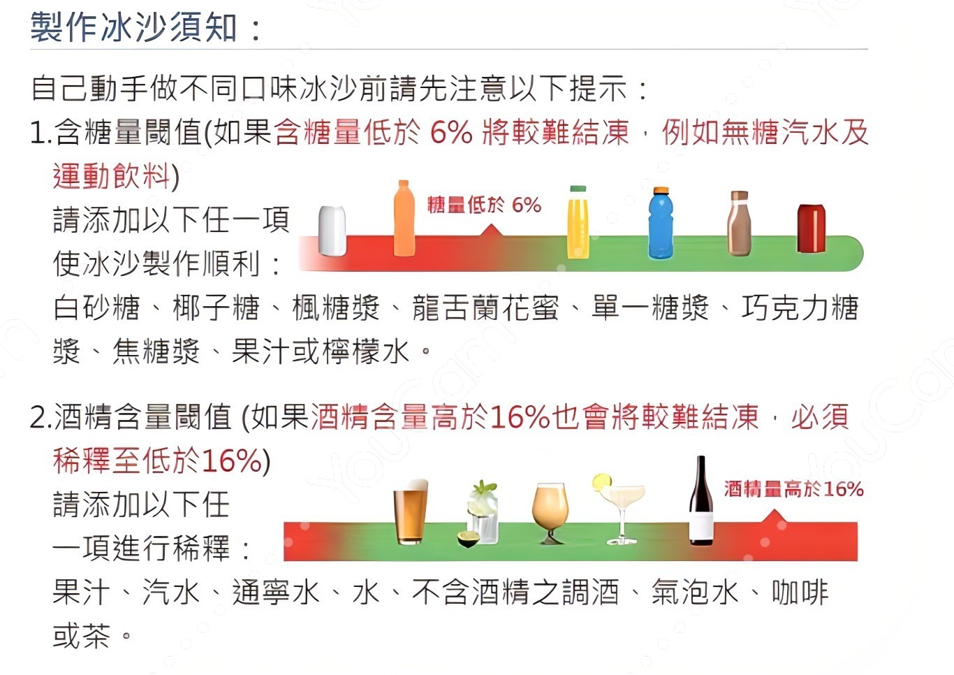 各模式配方比例請參考說明書,以達到最佳冷凍效果。