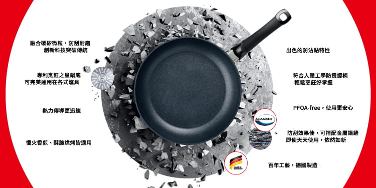 - 獨家專利ADAMANT塗層,更耐磨、防刮,更可放心搭配金屬鍋鏟使用