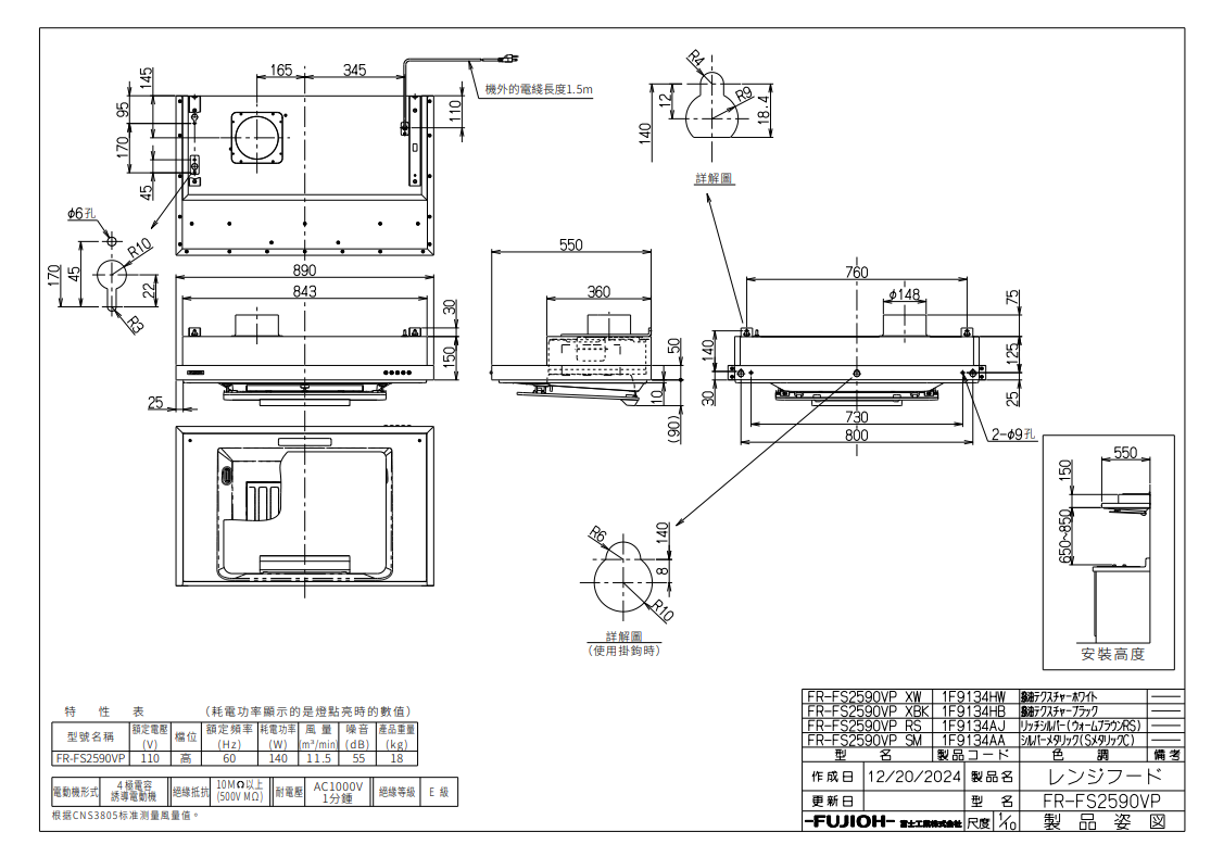 | 機體尺寸 (mm) | W890 × D550× H150 |