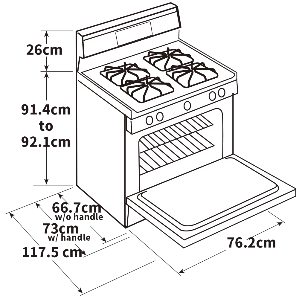 | 商品尺寸 | 機體寬度 76.2 cm 機體深度 66.7 cm (不含把手) 73 cm (含把手深度) 117.5 cm (門打開深度) 機體高度 117.5 cm(調整腳) 爐面高度 91.4 – 92.1cm |