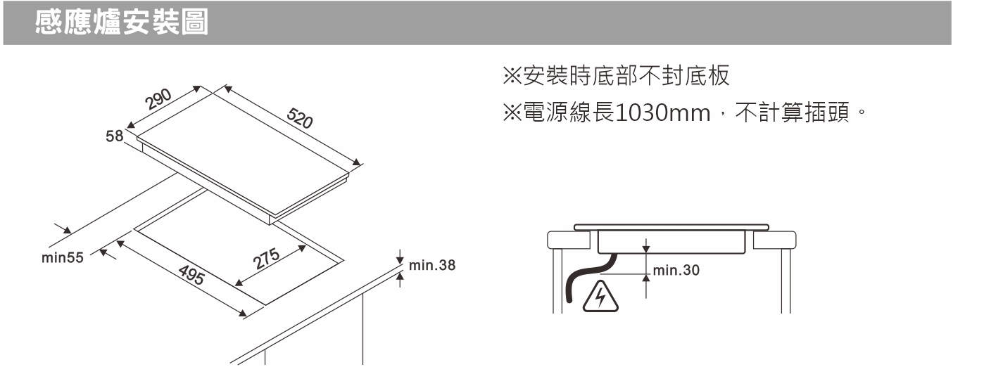 W290*D520*H58 mm挖孔尺寸(寬x深)