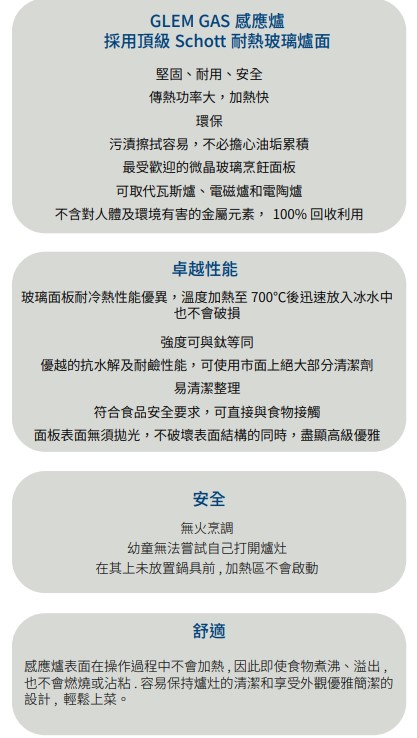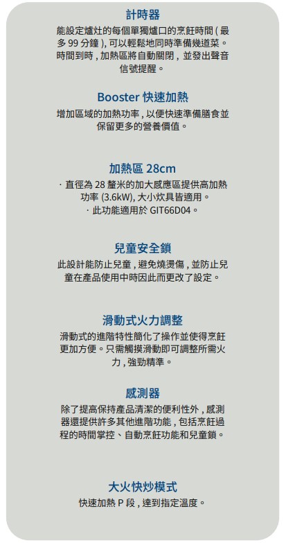 功能與特性 九段火力調整 Eurkera玻璃面板 電子計時器 觸控裝置 快速加熱功能
