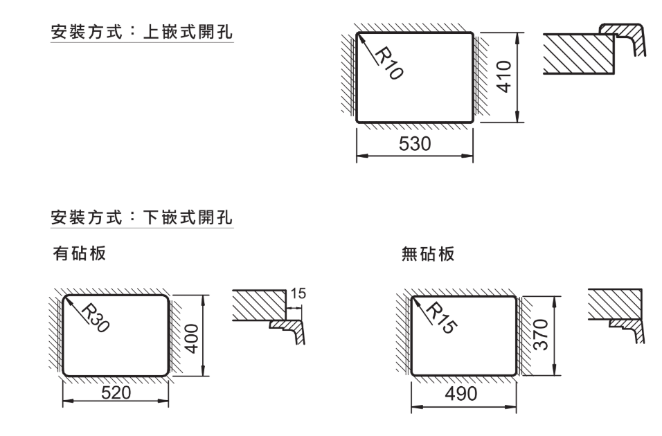 - 安裝方式:上嵌/下嵌