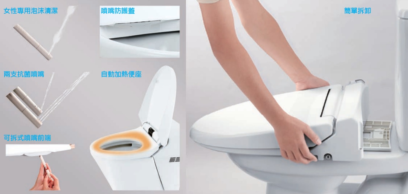[日本原裝] 簡單幾個安裝動作即可享受科技衛浴帶來的舒爽潔淨! ・一體成形便座 ・女性專用貼心噴嘴 ・噴嘴前端拆卸 ・快拆設計 ・國際SIAA抗菌認證
