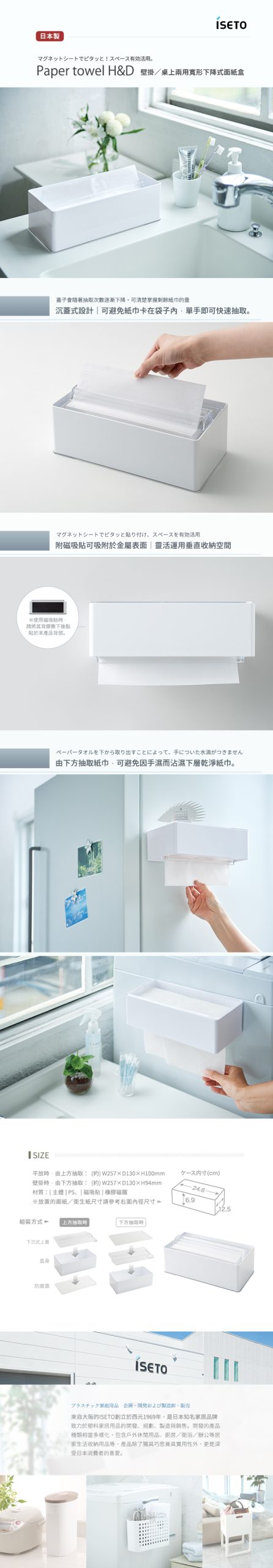 .日本製造,沉蓋式設計方便單手抽取 .蓋子會隨紙量下降,剩餘量一目了然 .兩用設計,附磁吸貼可吸附於冰箱上 .極簡純色設計,打造清爽的舒適空間