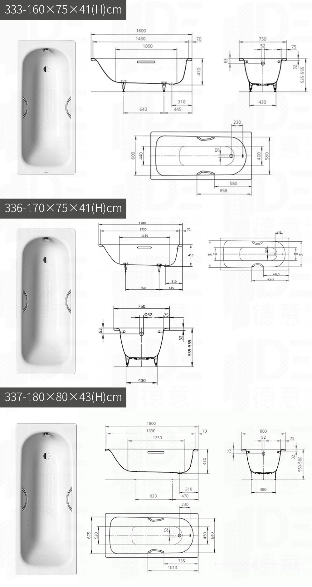 鋼板搪瓷浴缸·含雙把手(落水頭另購)
