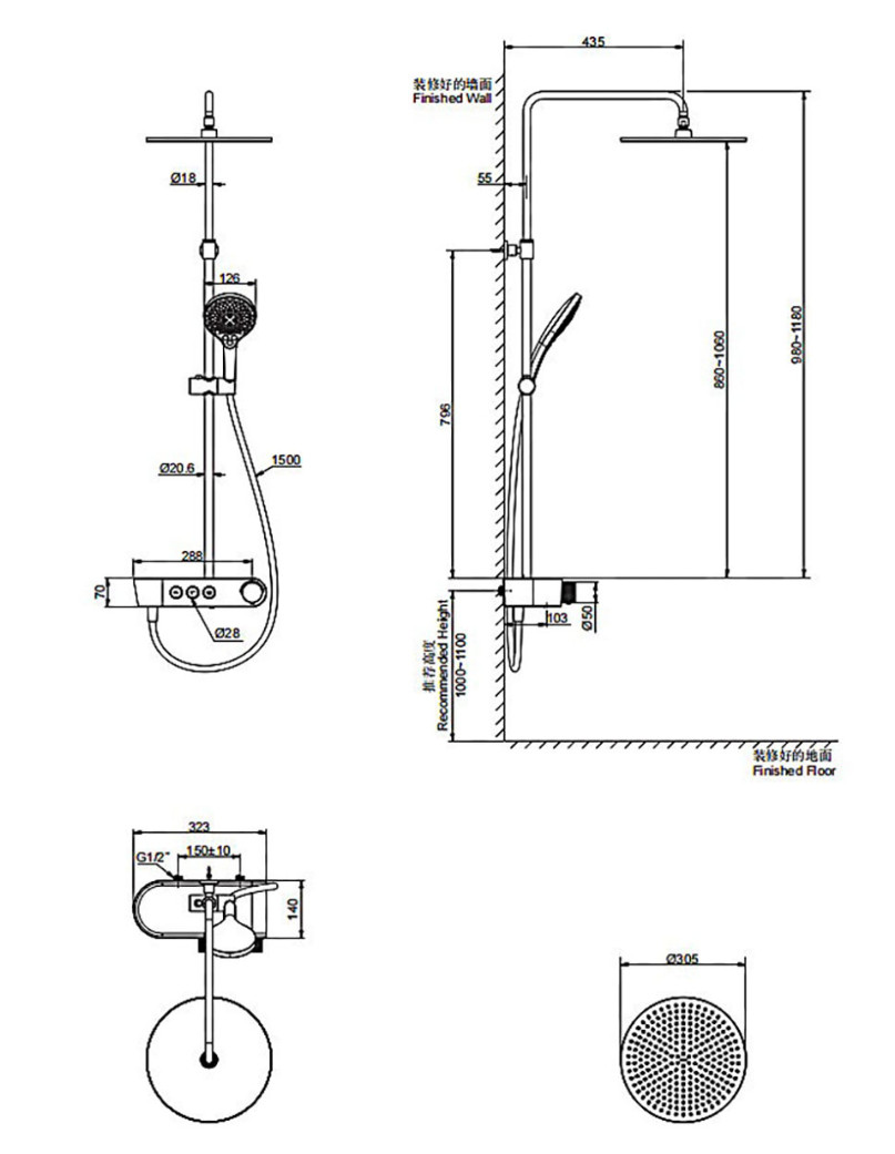 - 圓頂花灑: 12 吋圓形大面寬 (WaterMind 技術)