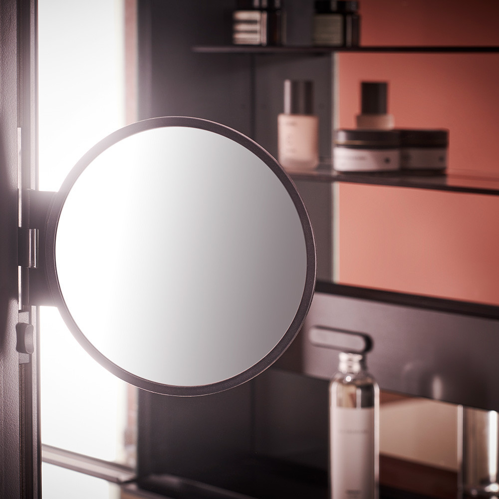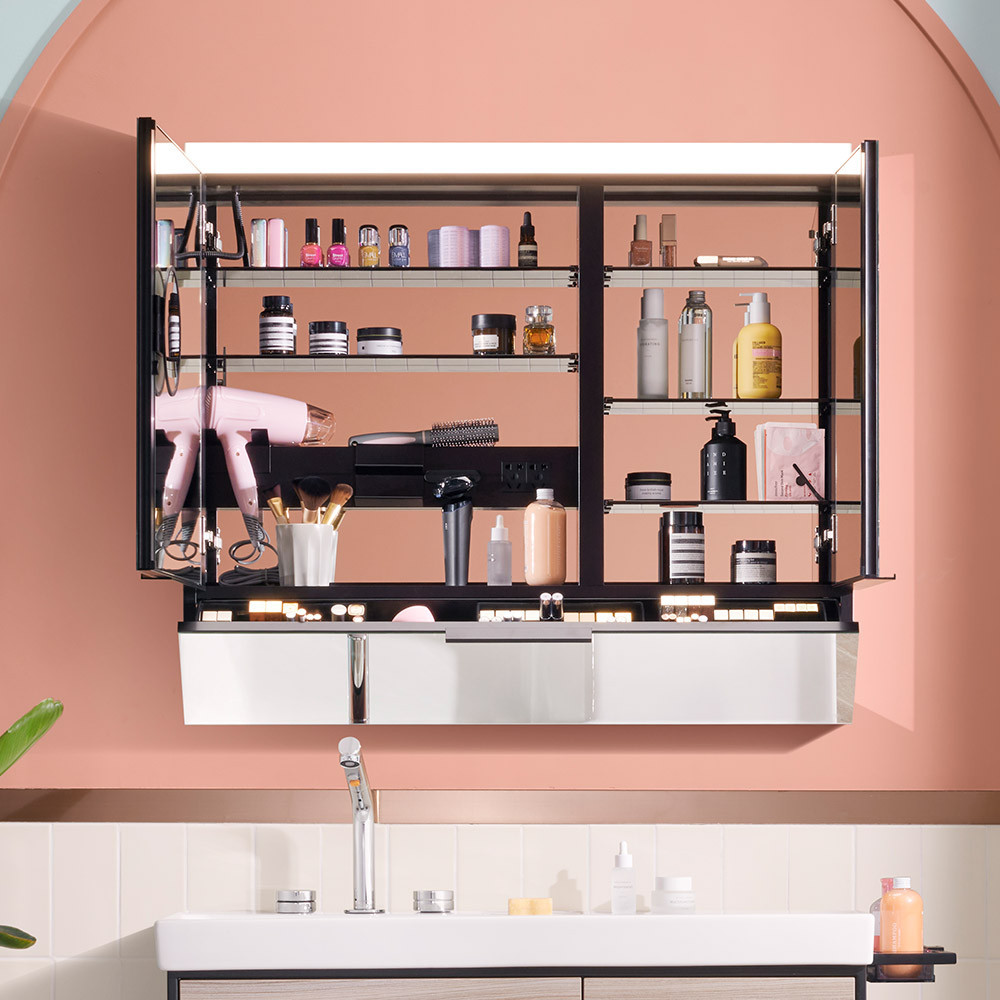 - 職人級收納組: 內建吹風機架、插座、面膜架、磁力圈,讓每件小物都有家。
