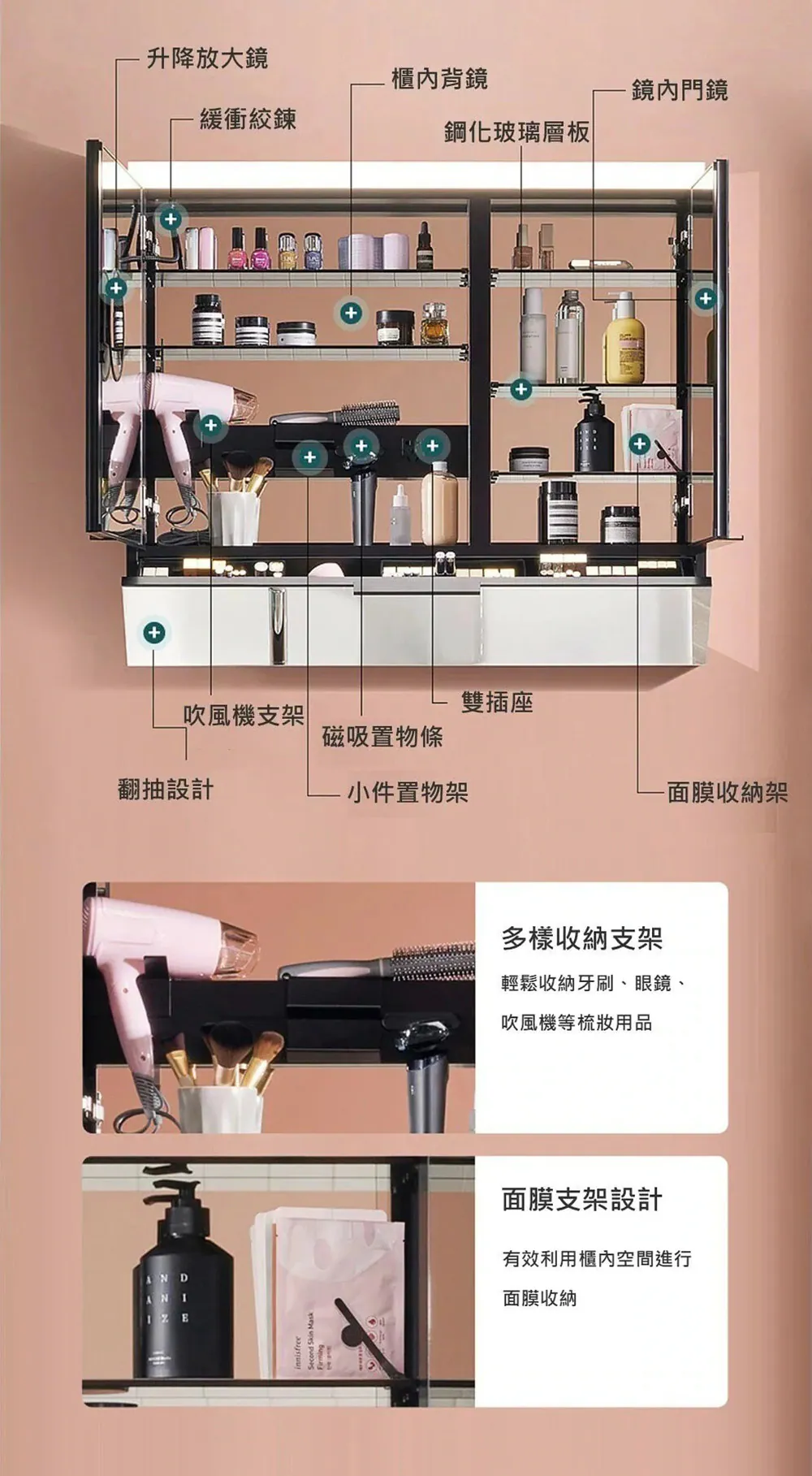 - 內部配置: 吹風機專用架、內建插座、磁力圈、小物置物架