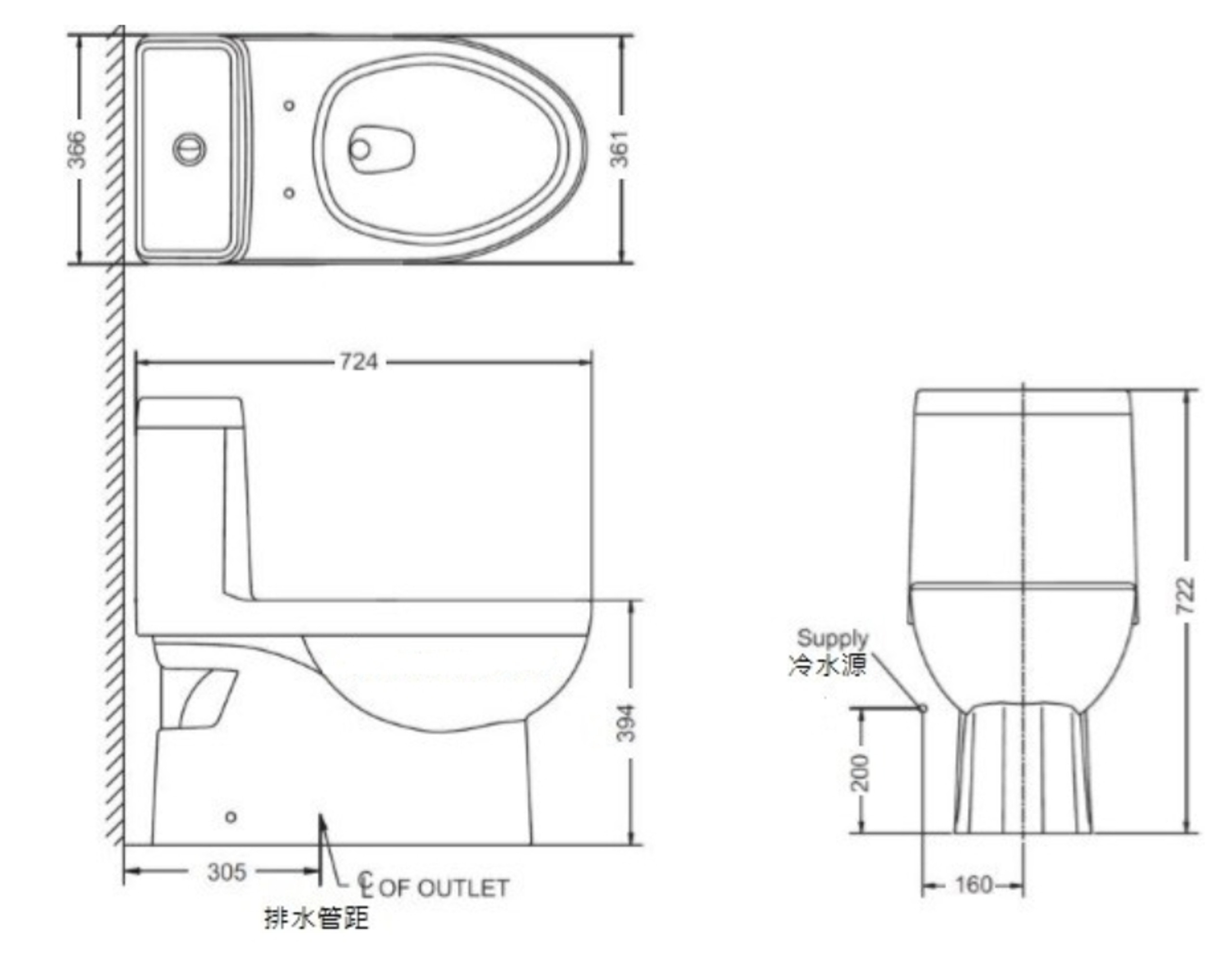 - 排水管距:305mm