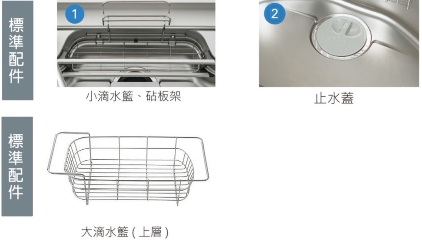 特色:導流洩水、防盜汗、靜音、水槽空間大、大型落水口、配件齊全