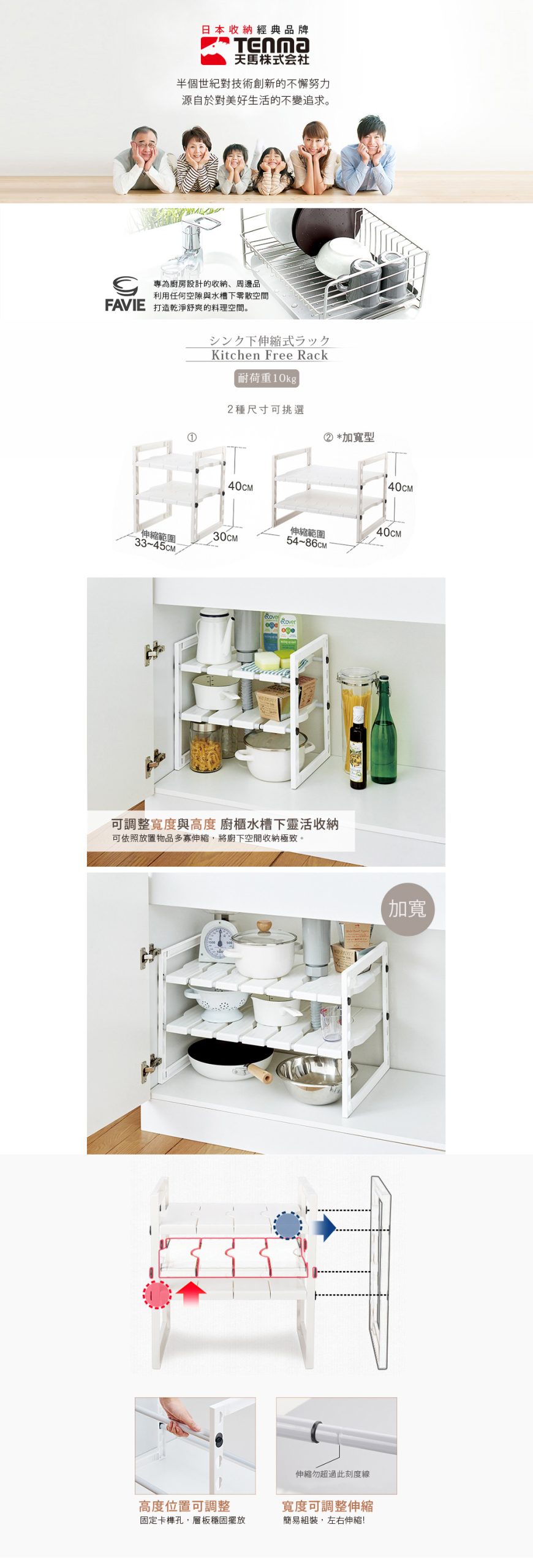 .寬度可伸縮,層板高度可調整 .可調式層板,方便廚下水管穿過 .層架穩固可耐重達10KG