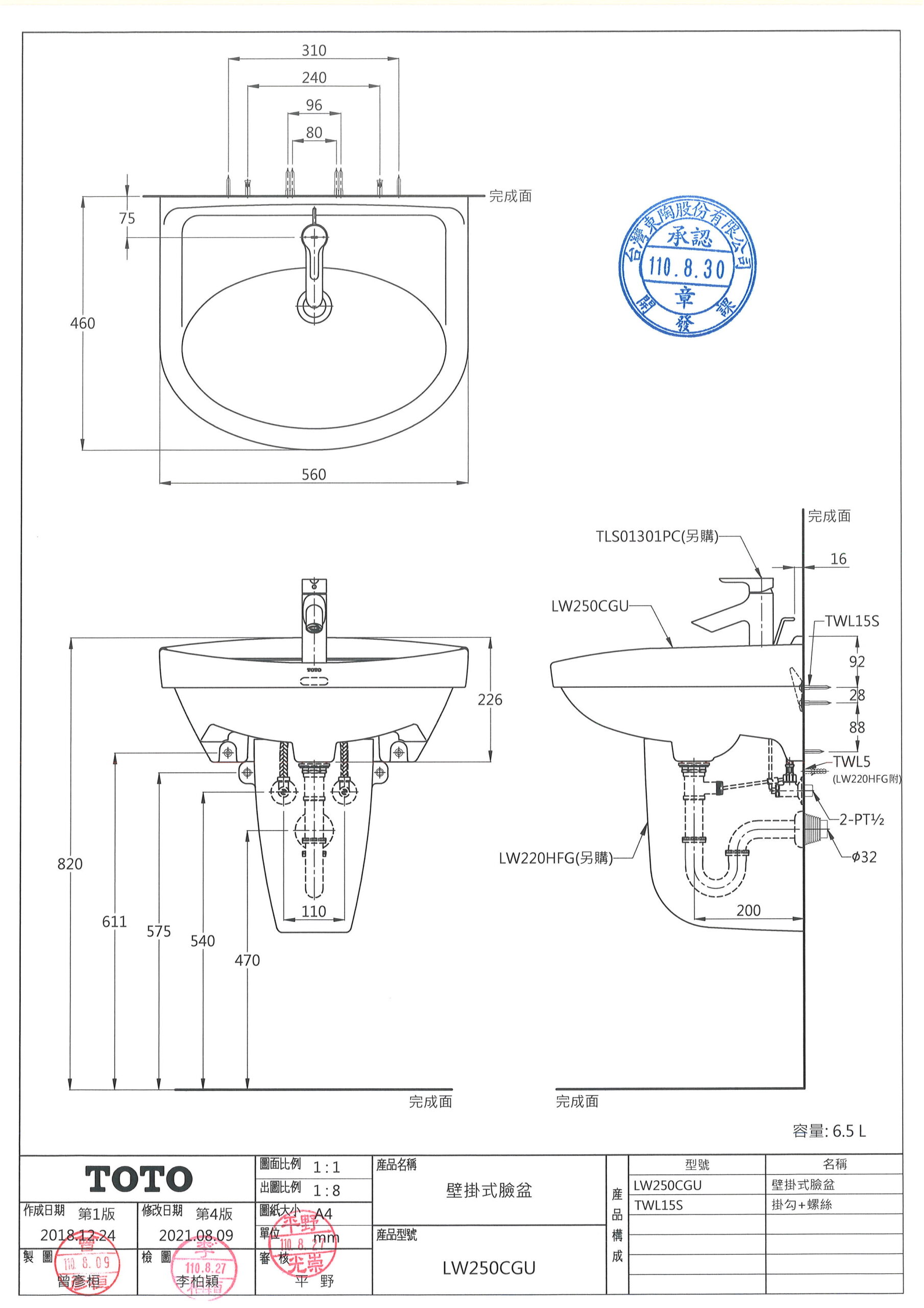 【格蘭登】日本 TOTO 半柱壁掛式臉盆 LW250CGU+LW220HFG 限時優惠~2026/08/31